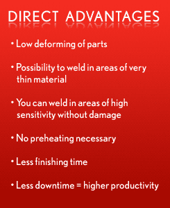 The difference between laser welding and all other traditional methods of welding and soldering is the lasers ability to produce the necessary energy required for melting metal within 1/1000 sec. Due to that short period of time, there is no strong heating of the part. There is a significant amount of relaxatioin time compared to the duration of the energy pulse, keeping temperatures down.
